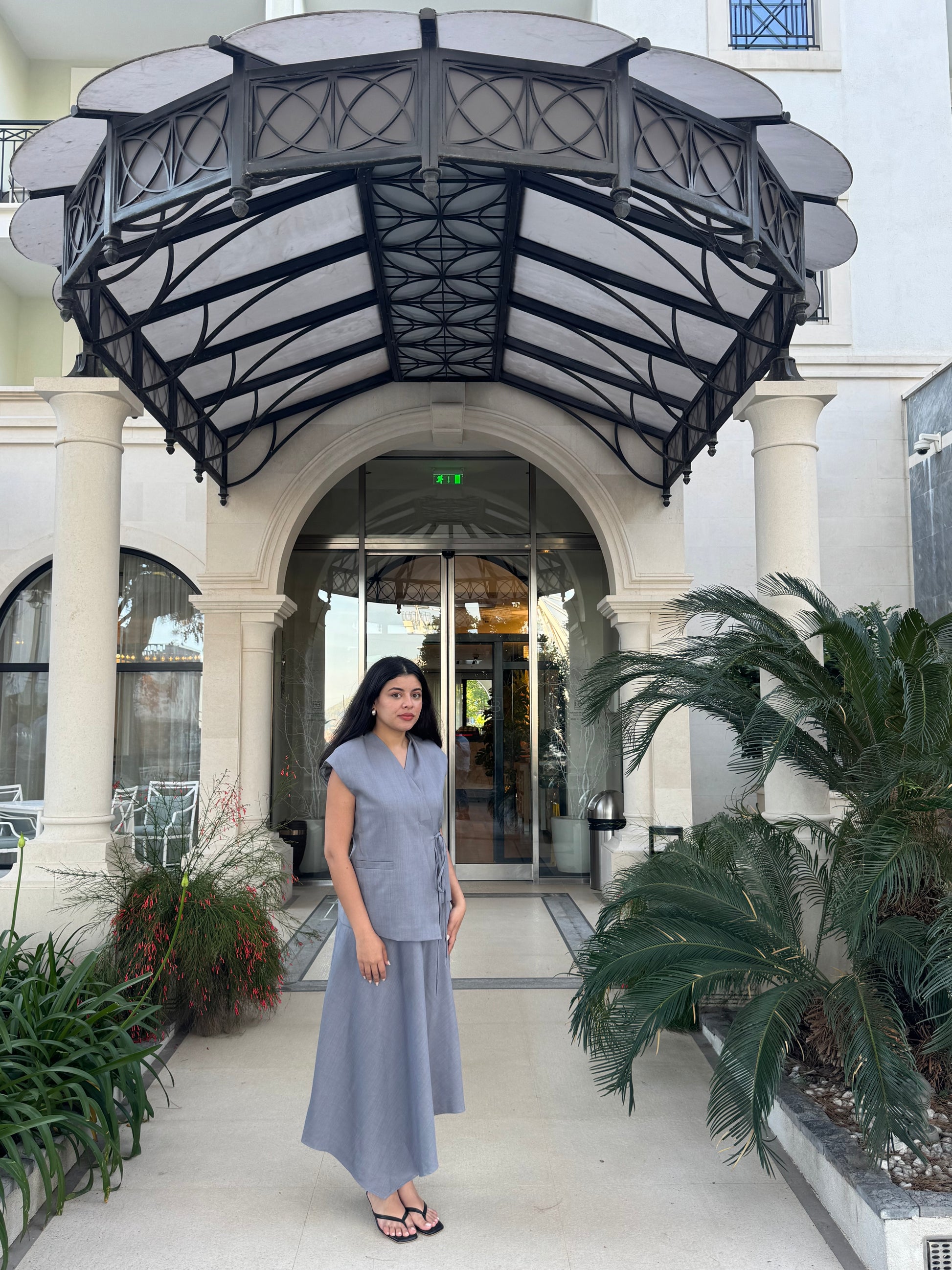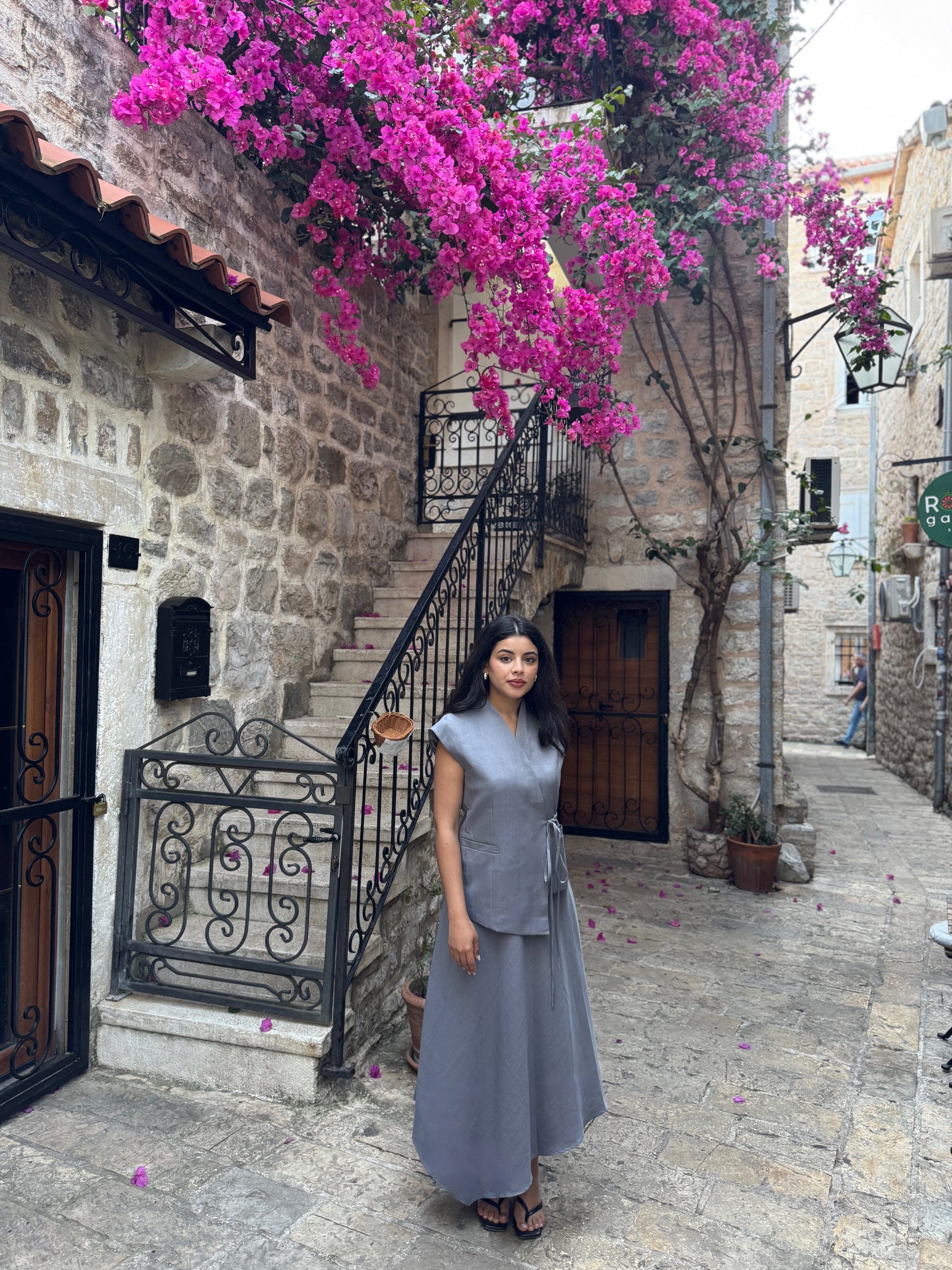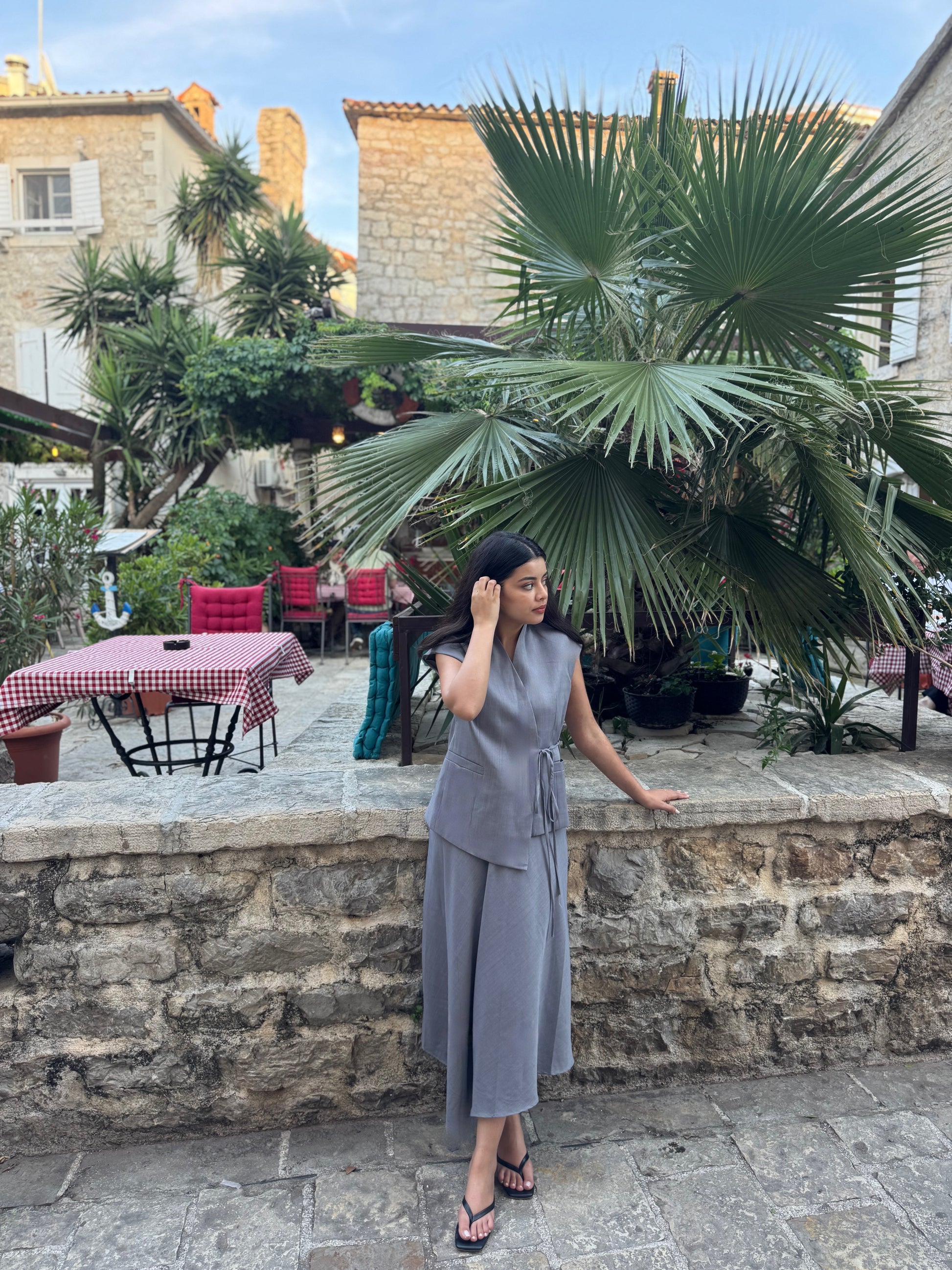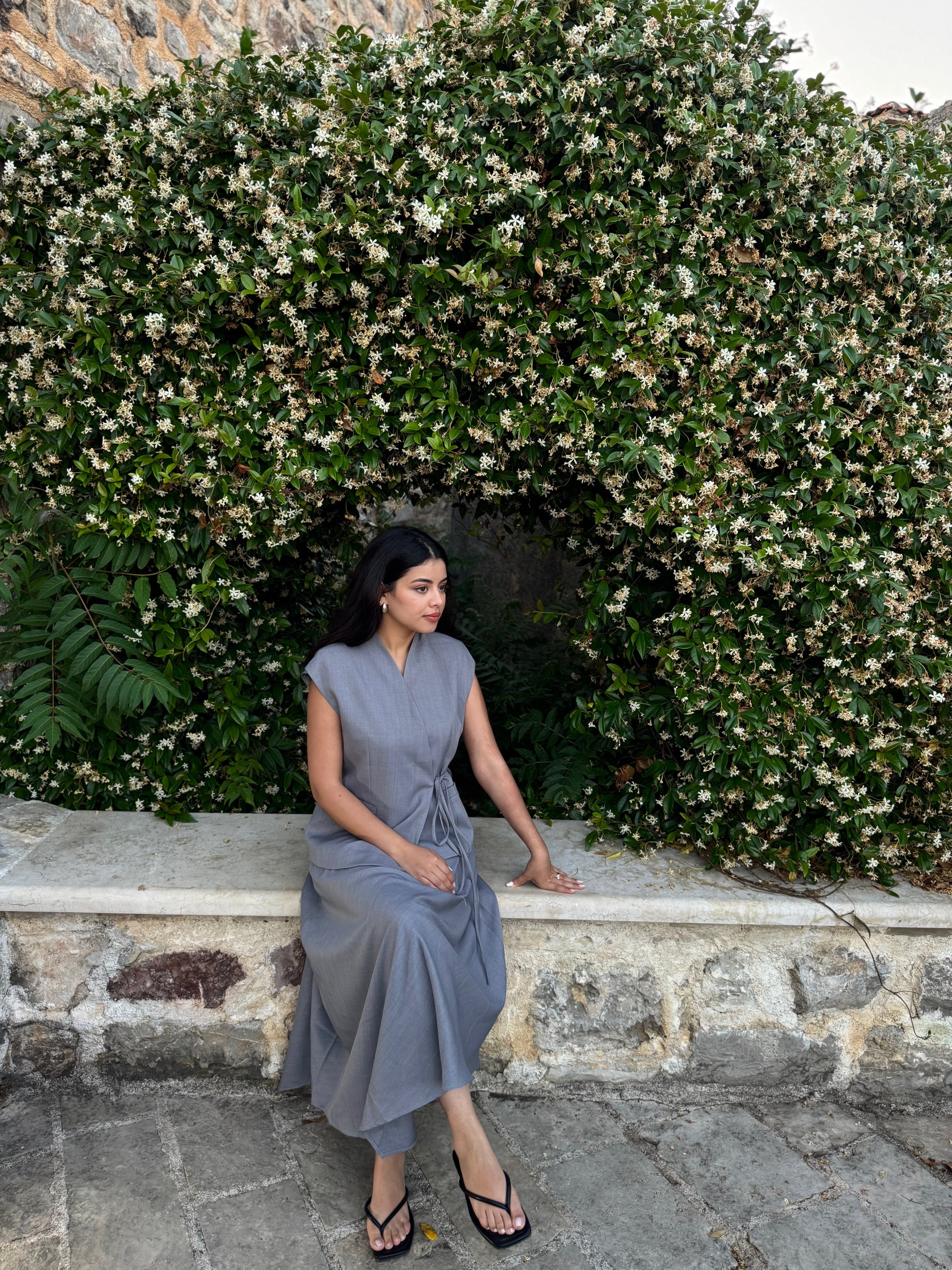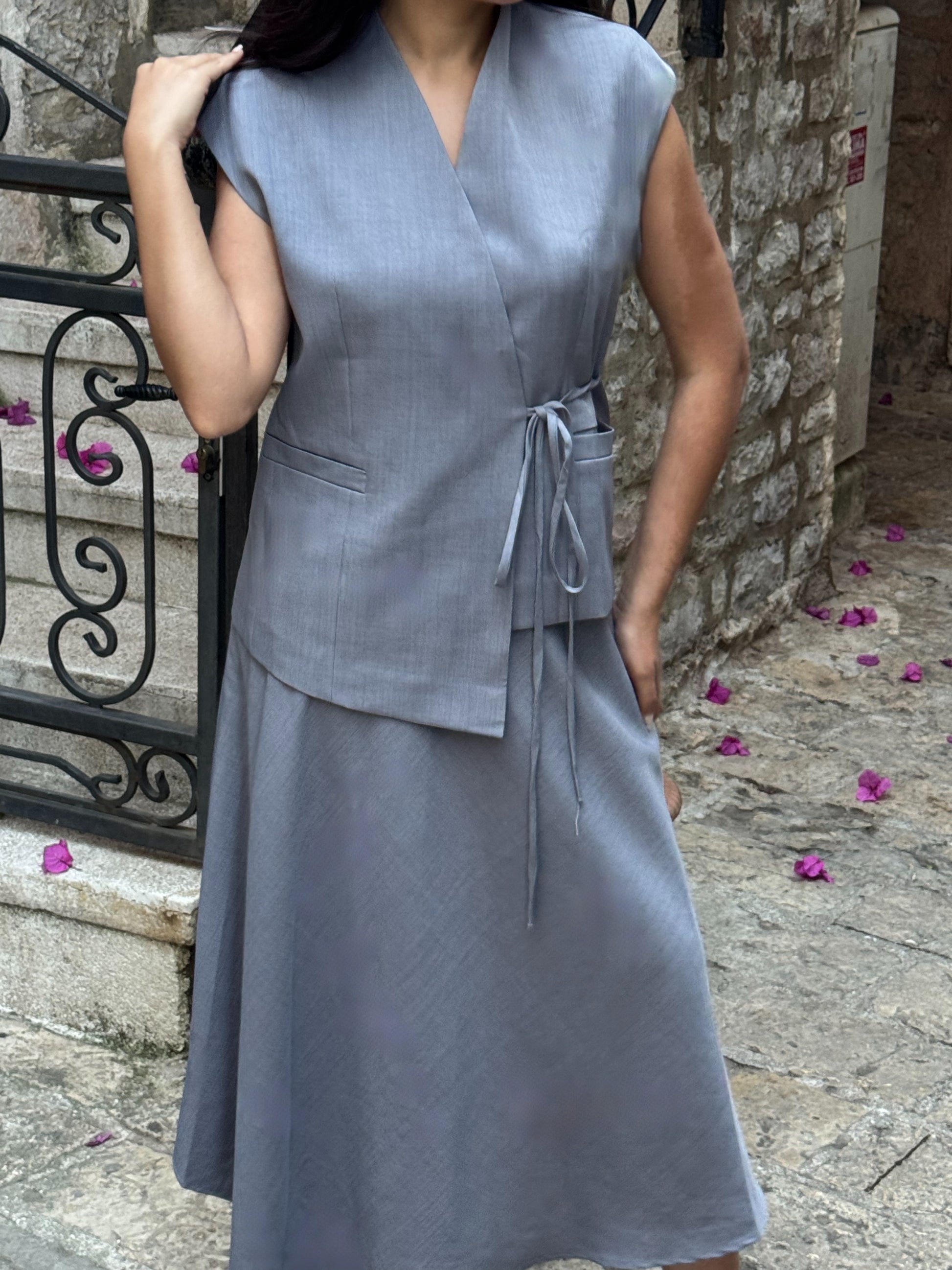A soft grey wrap-style co-ord featuring a cap-sleeve top with tie detail and a flowing midi skirt. Understated, tailored, and made for quiet moments of elegance.