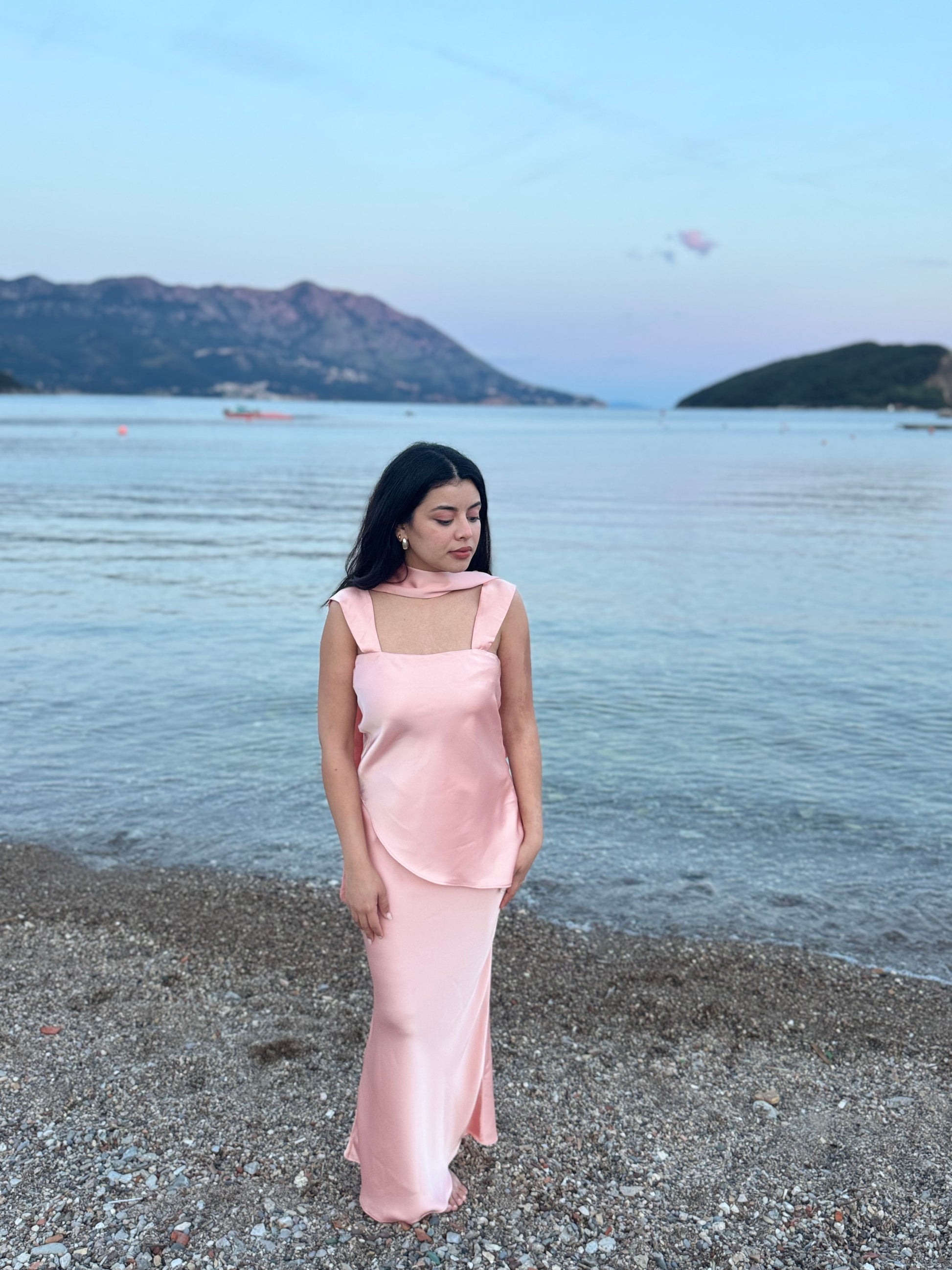 A soft satin co-ord in delicate blush, featuring a square-neck top with flowing scarf ties that trail down the back like a sea breeze. Paired with a fluid ankle-length skirt, this look captures movement, serenity, and romance