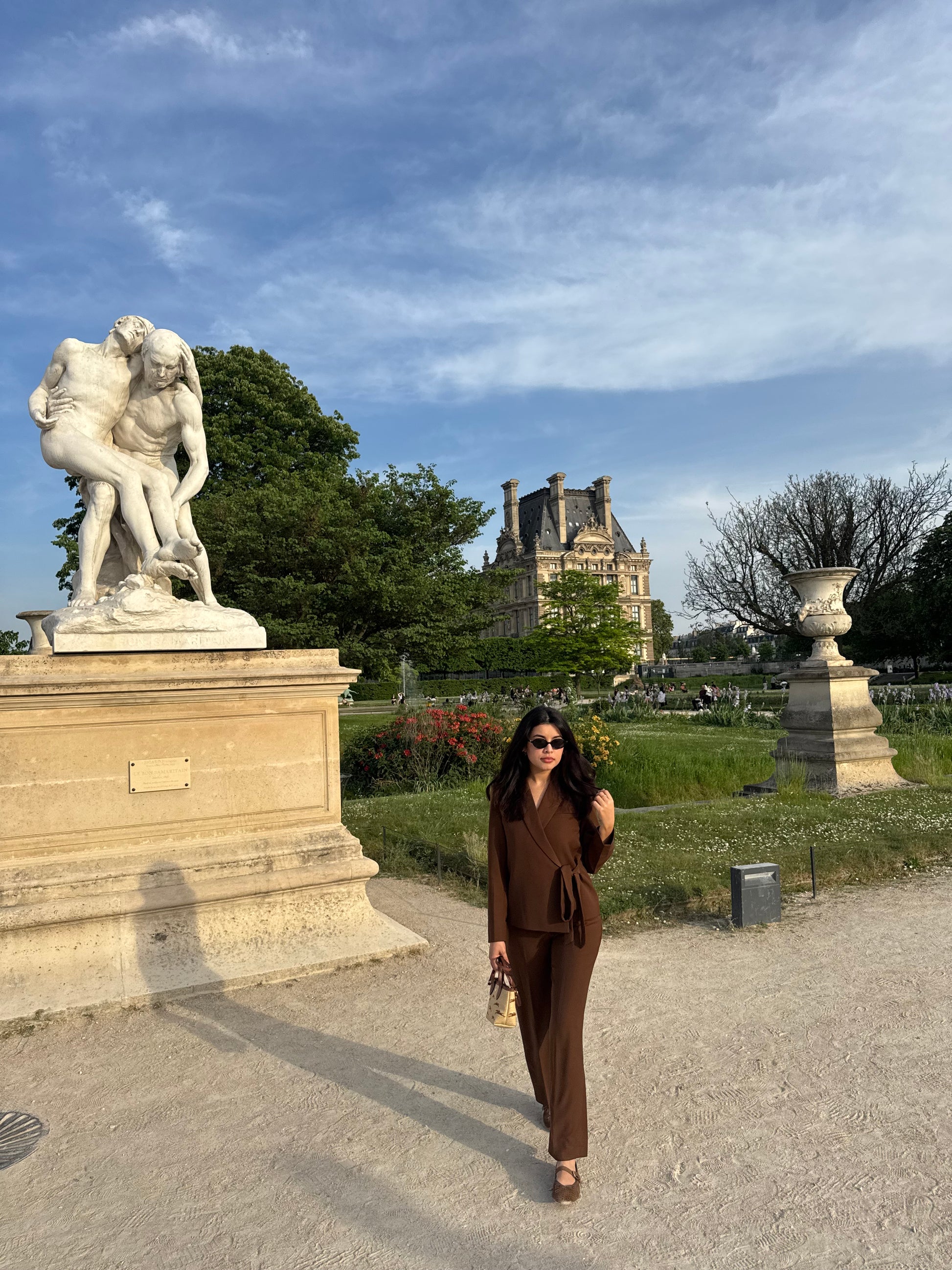 - Bottom: Straight-leg trousers with a subtle crop, designed to elongate the silhouette