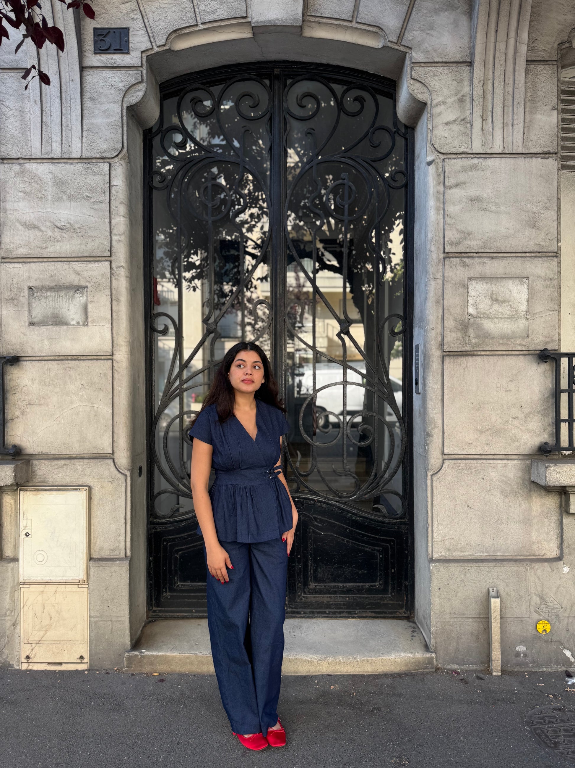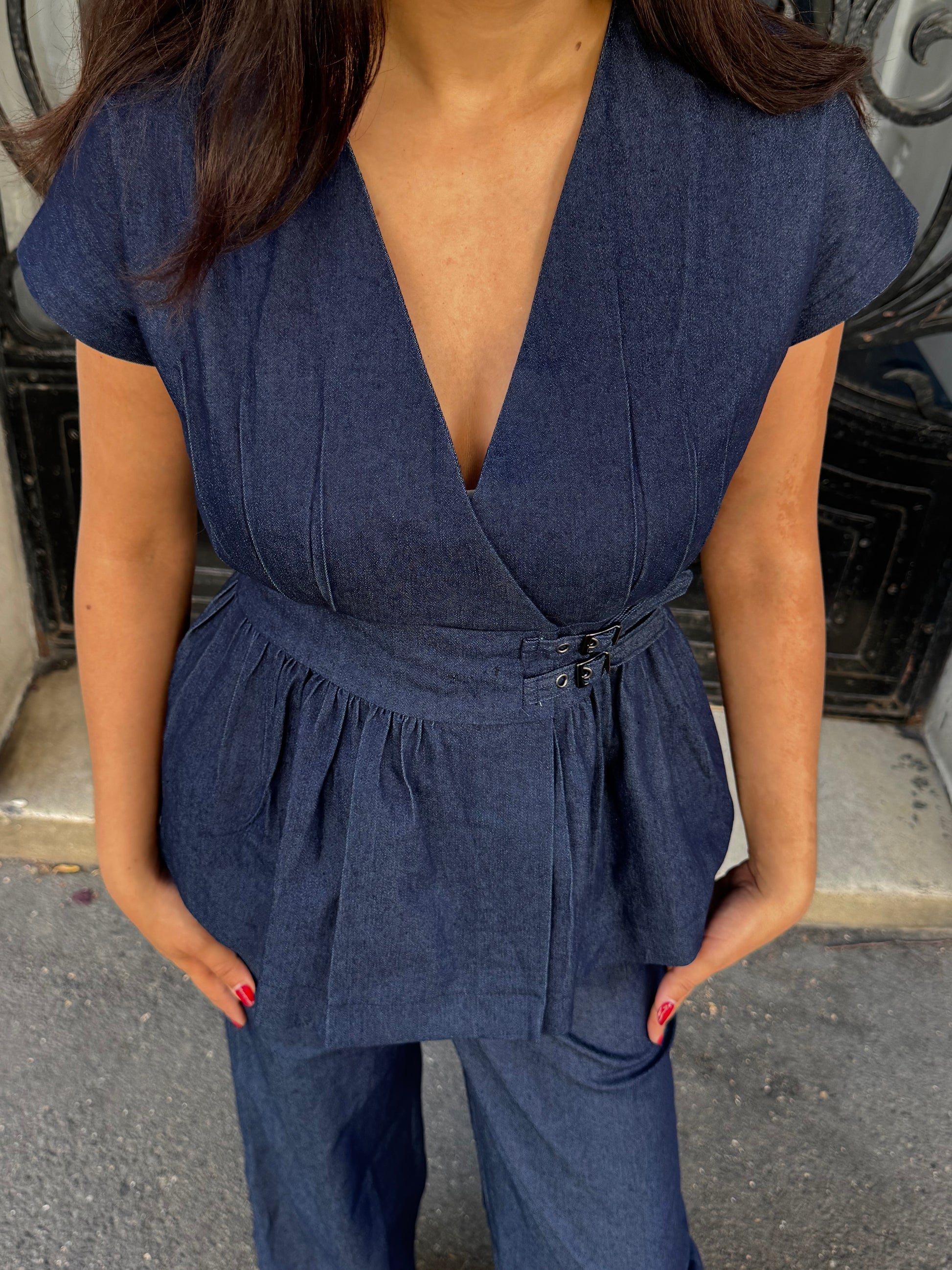 Elevate your everyday with the Midnight Chic set a confident blend of comfort and modern structure. Crafted from soft, breathable indigo fabric, this two-piece ensemble features a flattering wrap-style top with a cinched waist that defines the silhouette effortlessly. The wide-leg trousers flow with graceful ease, offering both versatility and polish.