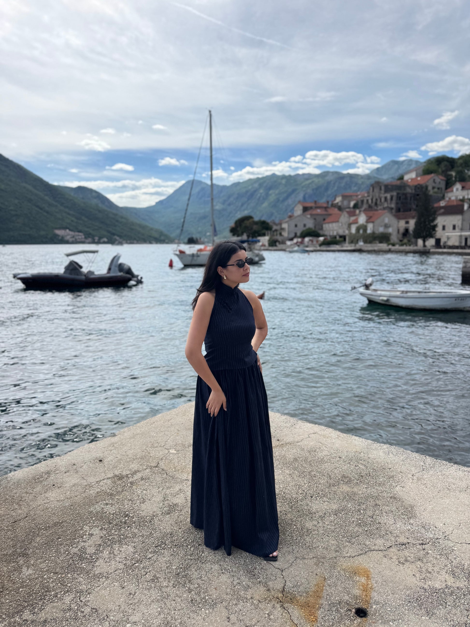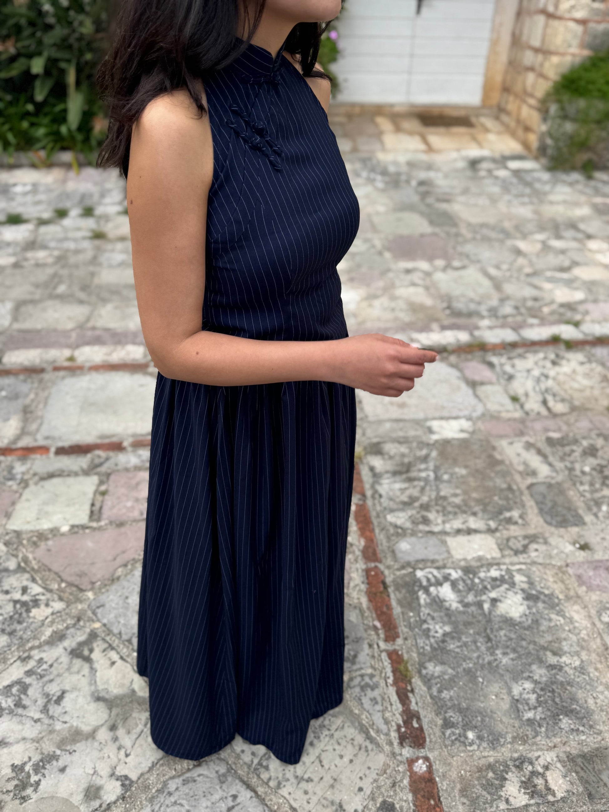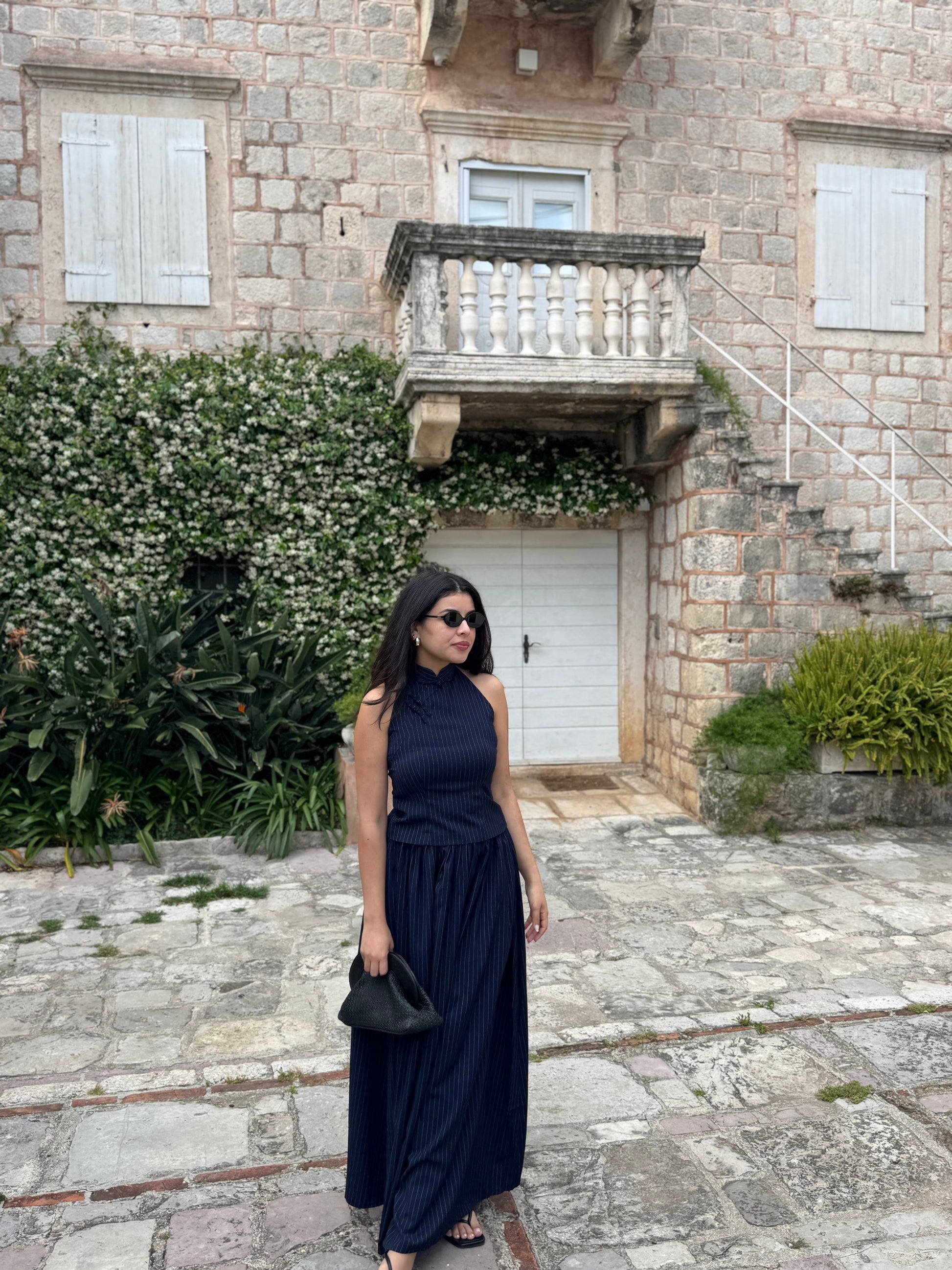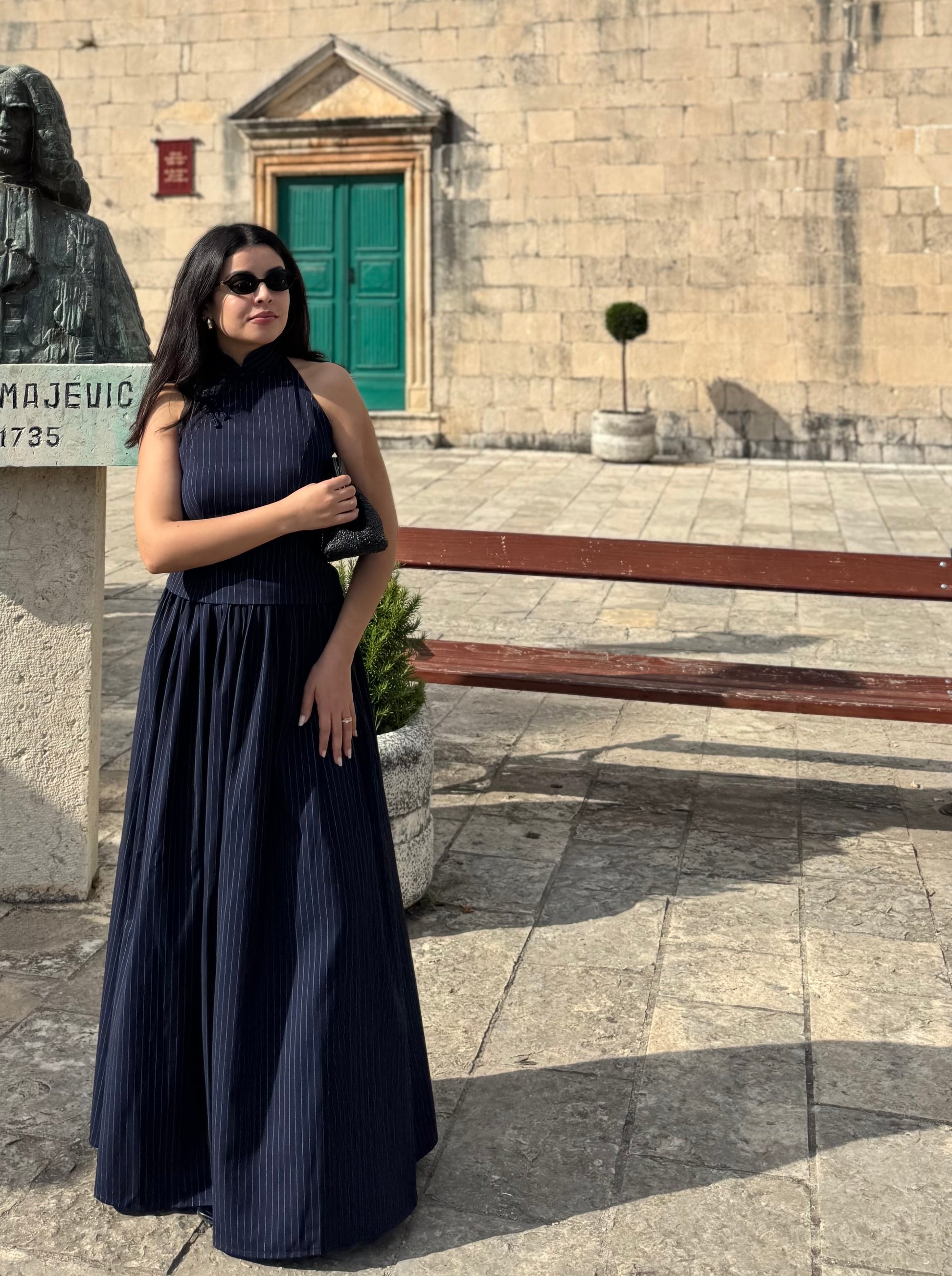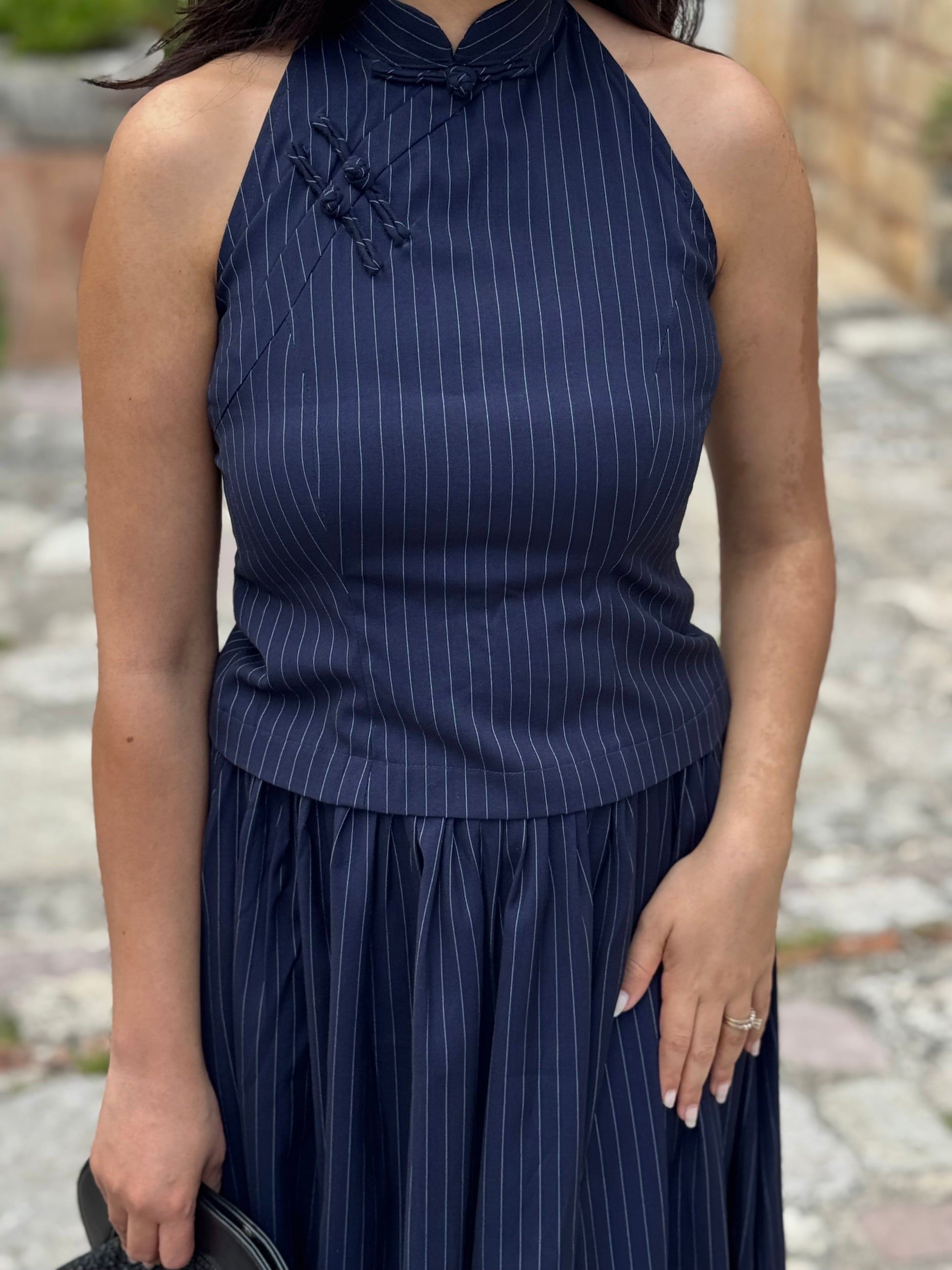 A sleek navy pinstripe co-ord featuring a high-neck sleeveless top with knot closure and a flowing maxi skirt. Refined, lightweight, and effortlessly coastal.