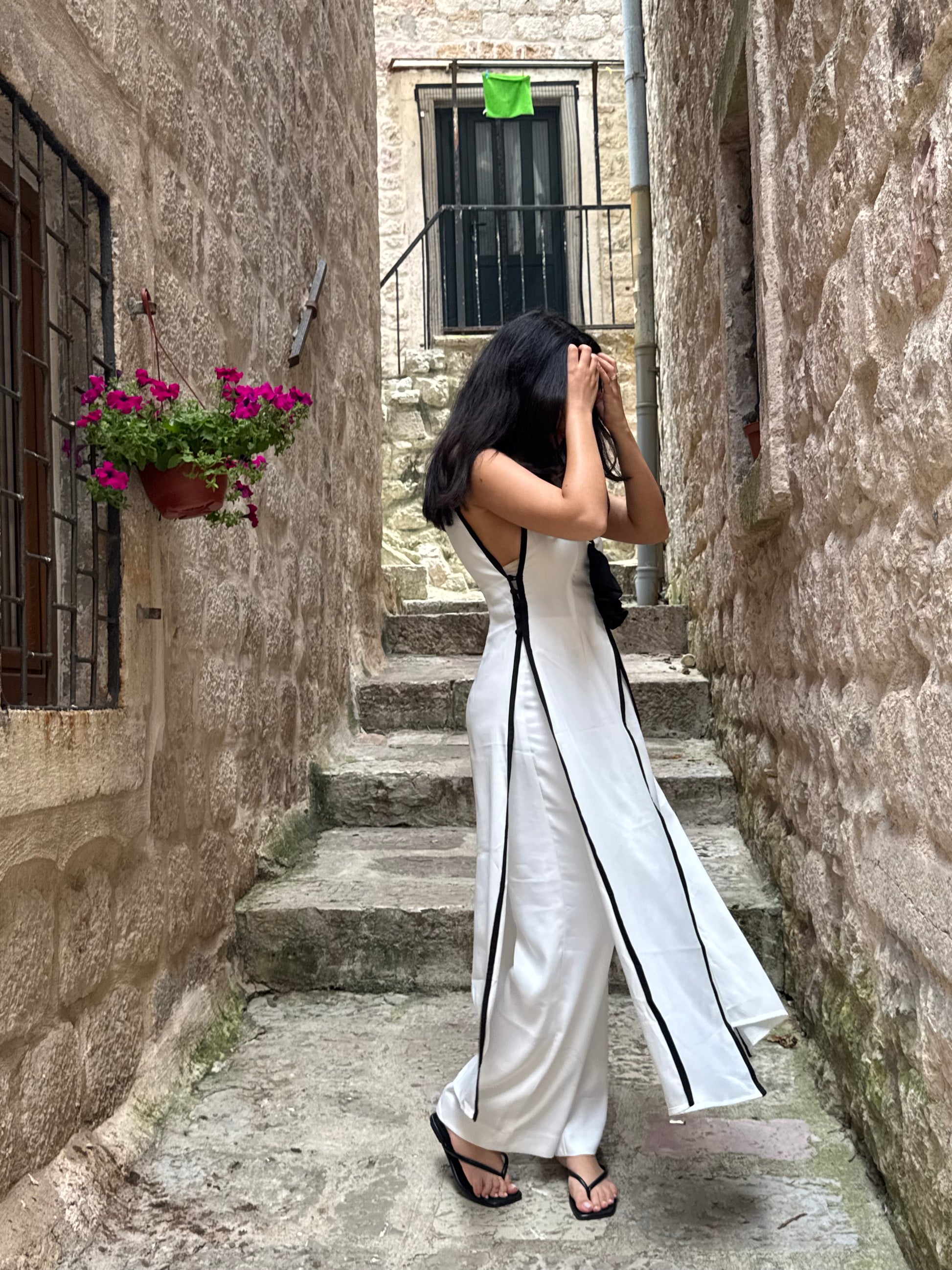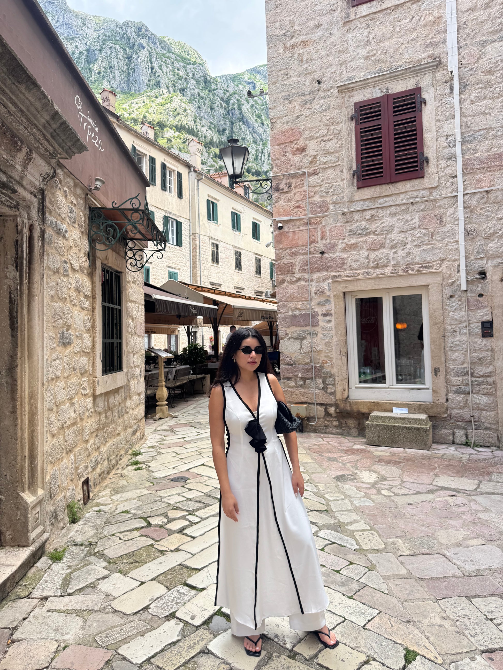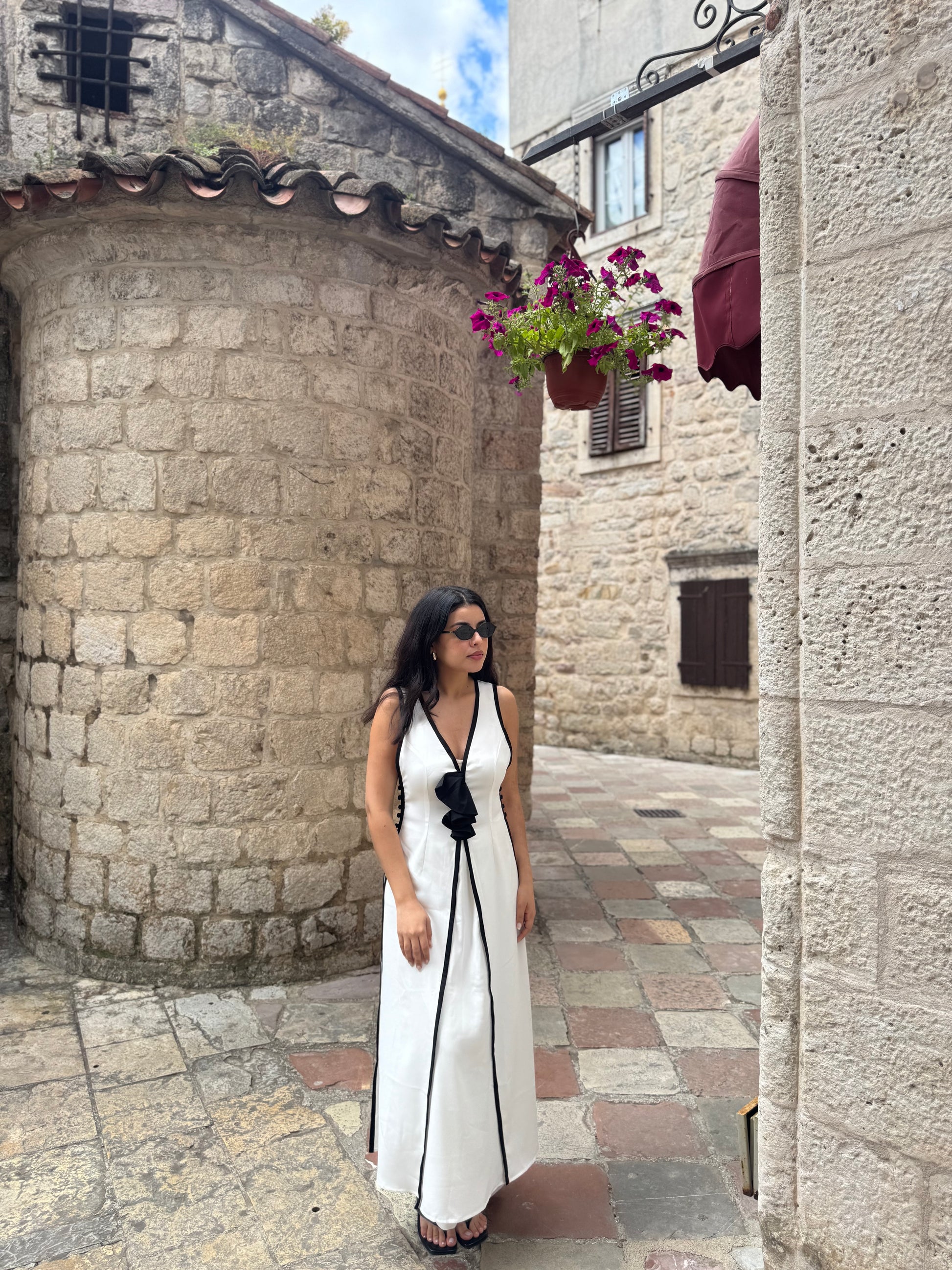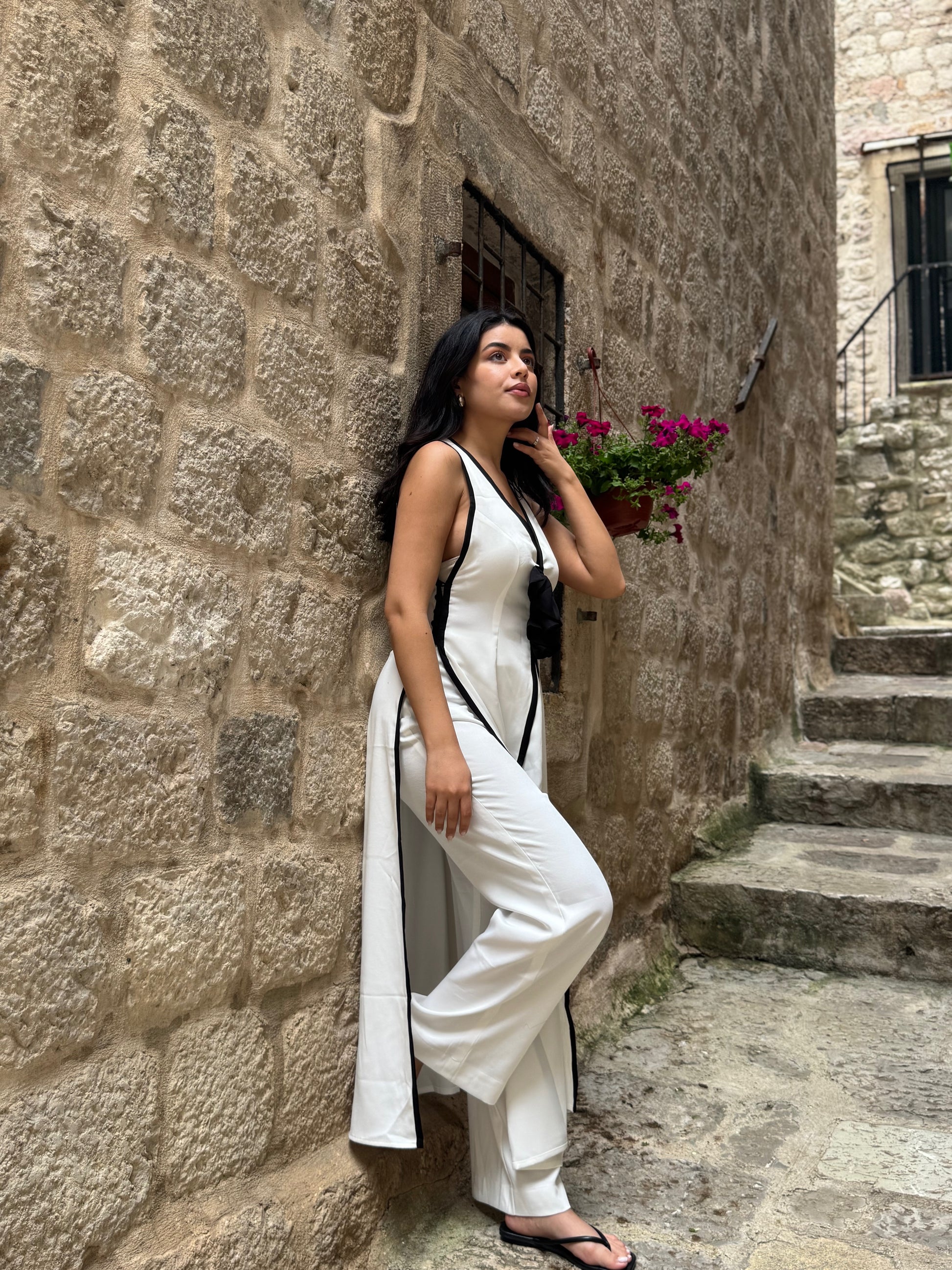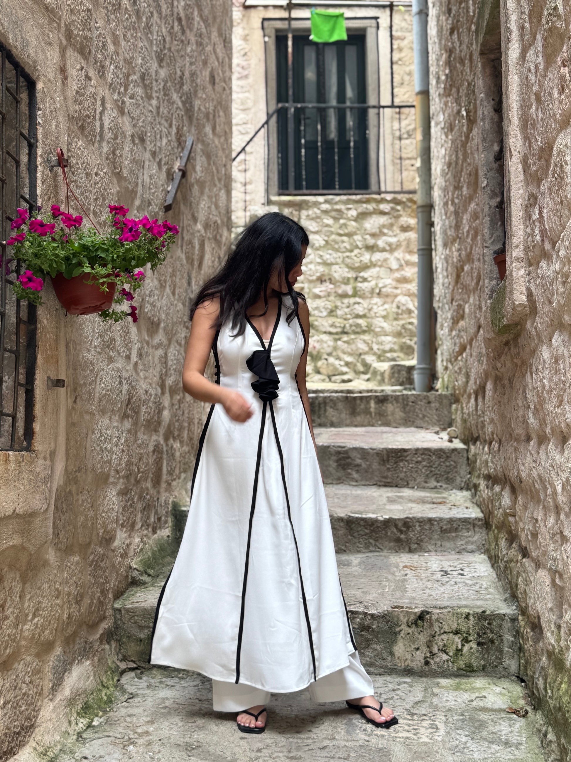 A sleek white set with bold black piping and a statement bow. Effortlessly elegant, perfect for day strolls or evening charm.