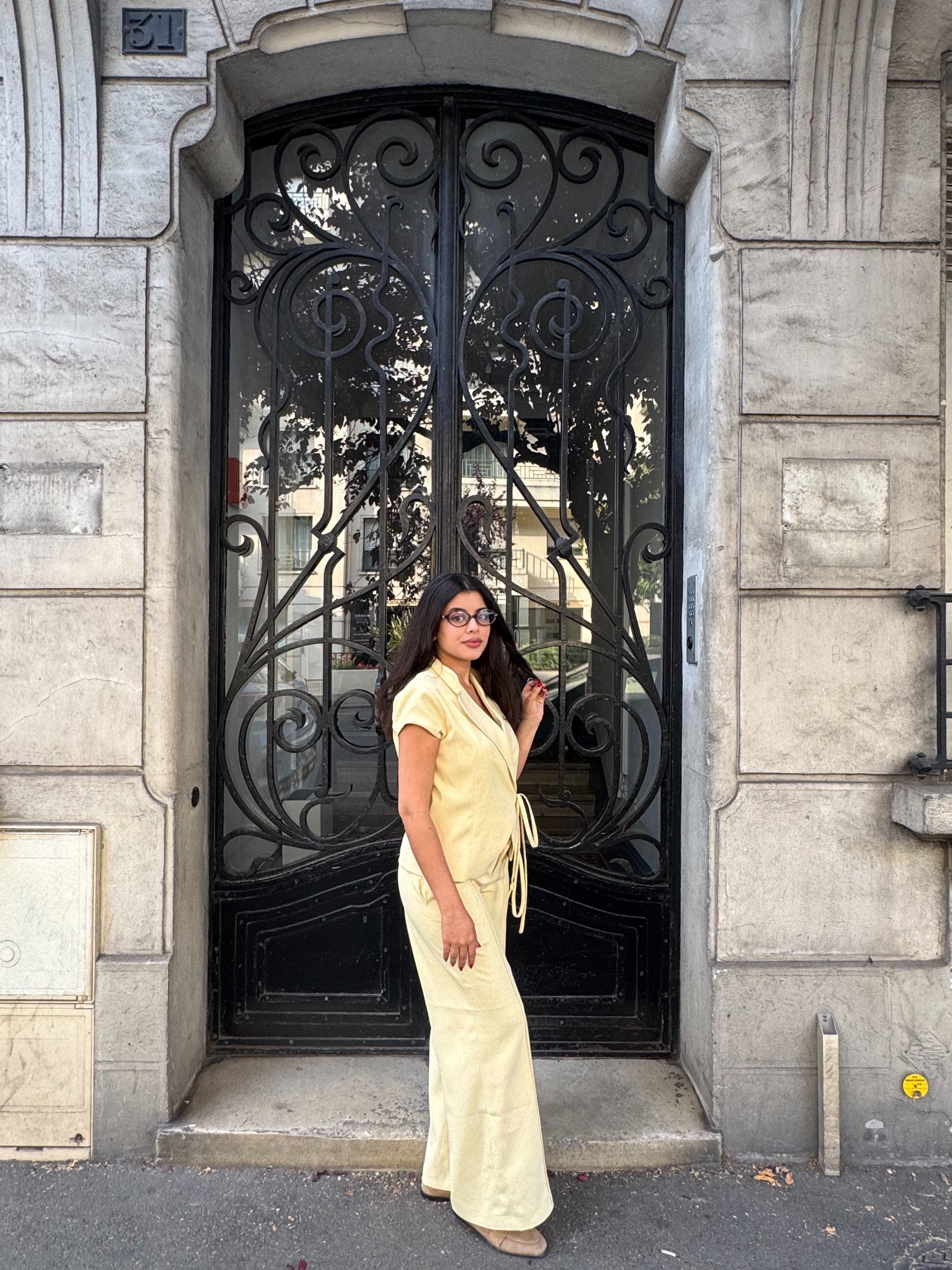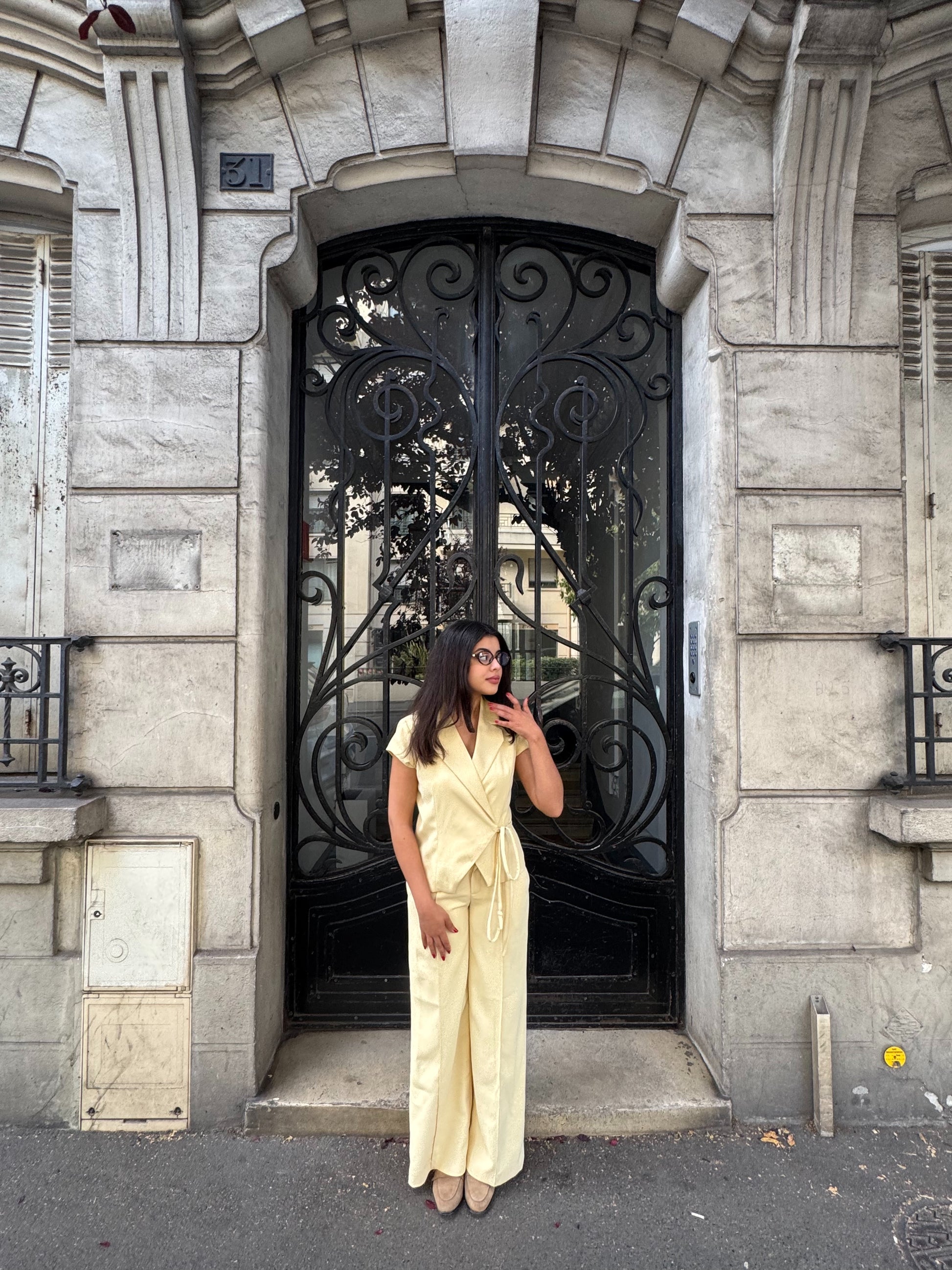 A smooth butter-yellow co-ord featuring a softly tailored wrap top with a tie waist and matching wide-leg trousers. Light and luminous, the set channels understated elegance with a sun-warmed glow ideal for city strolls and calm moments in motion.