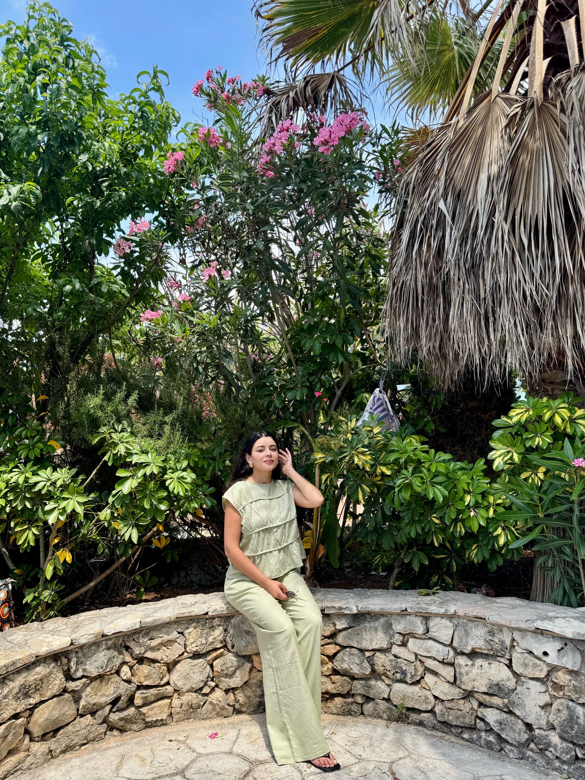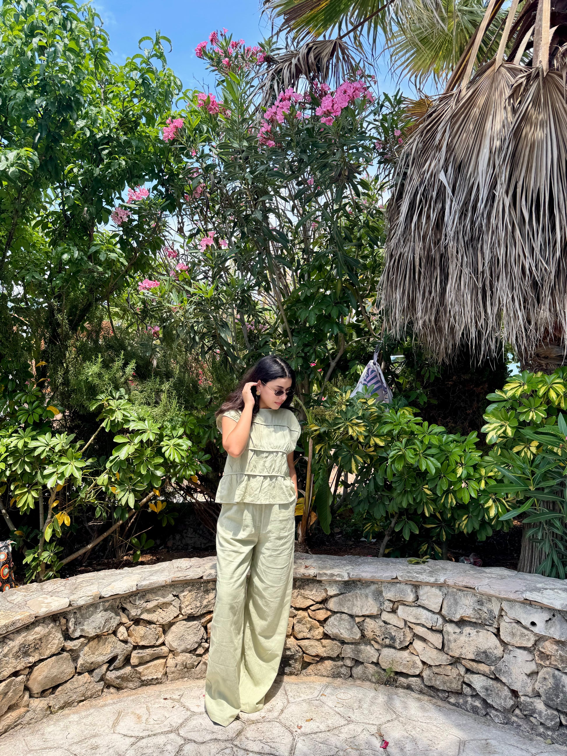 A breezy sage green linen set designed for relaxed elegance. The sleeveless top features a soft layered peplum silhouette with subtle gathers for volume and ease. Paired with fluid wide-leg trousers, this set offers comfort, movement, and effortless charm—perfect for warm days and sunlit escapes