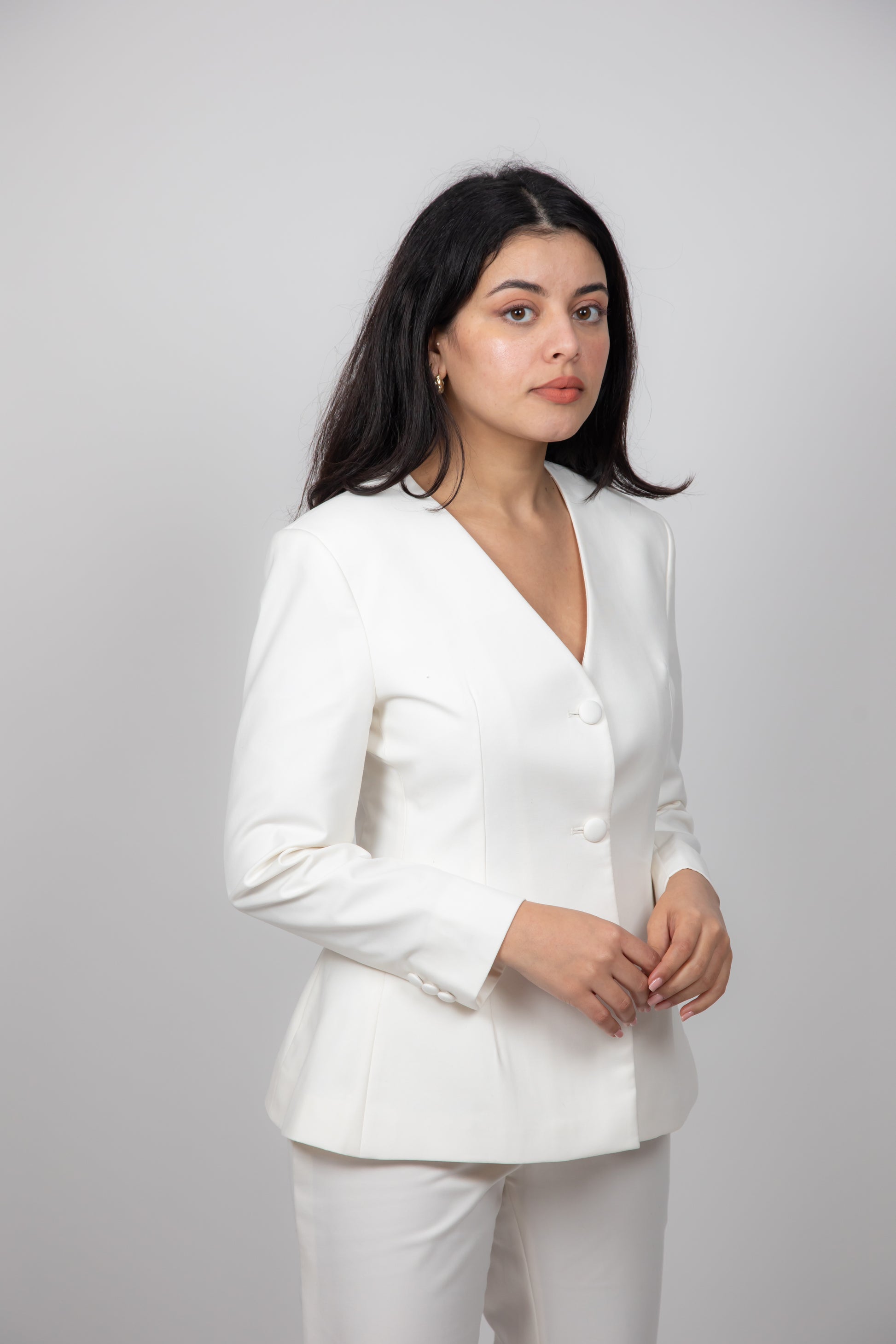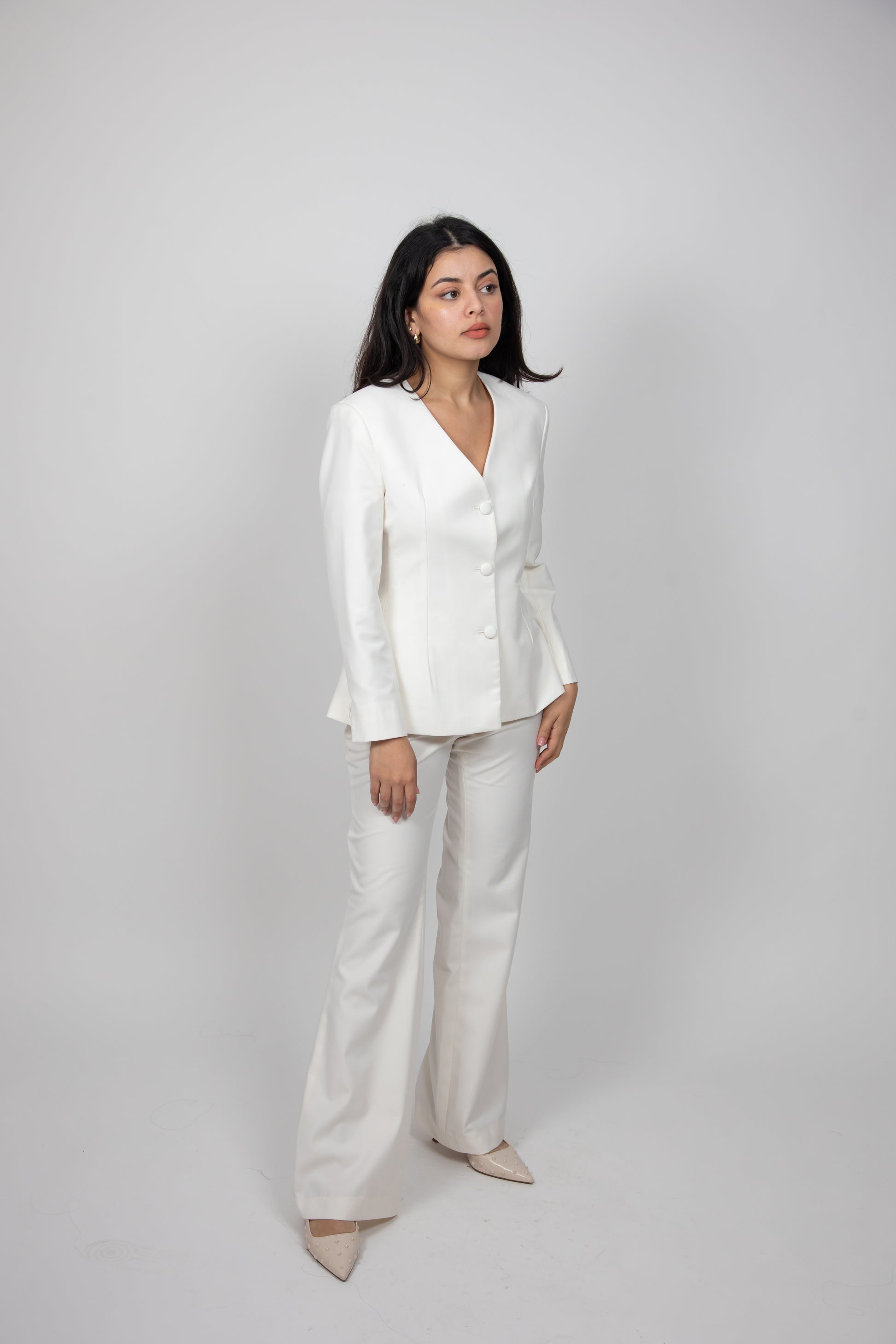 V-Neck Blazer: Elegant cut that enhances the structured fit