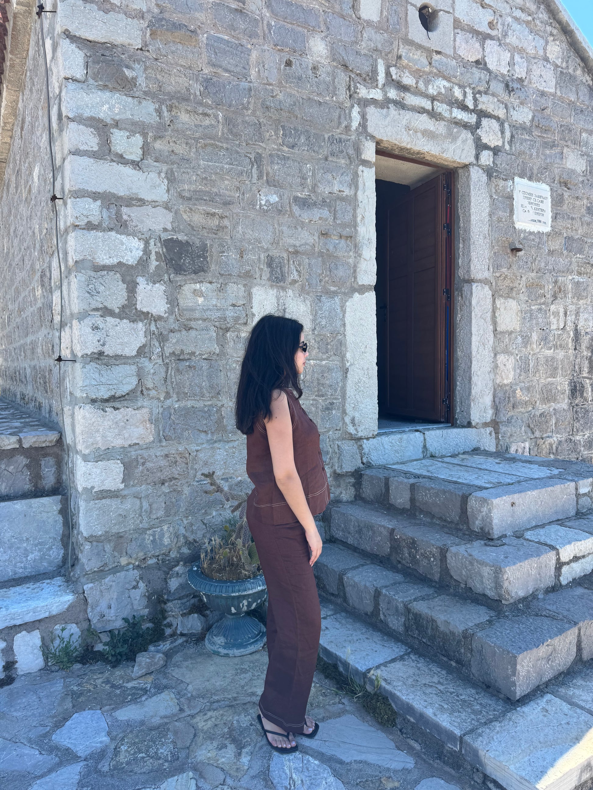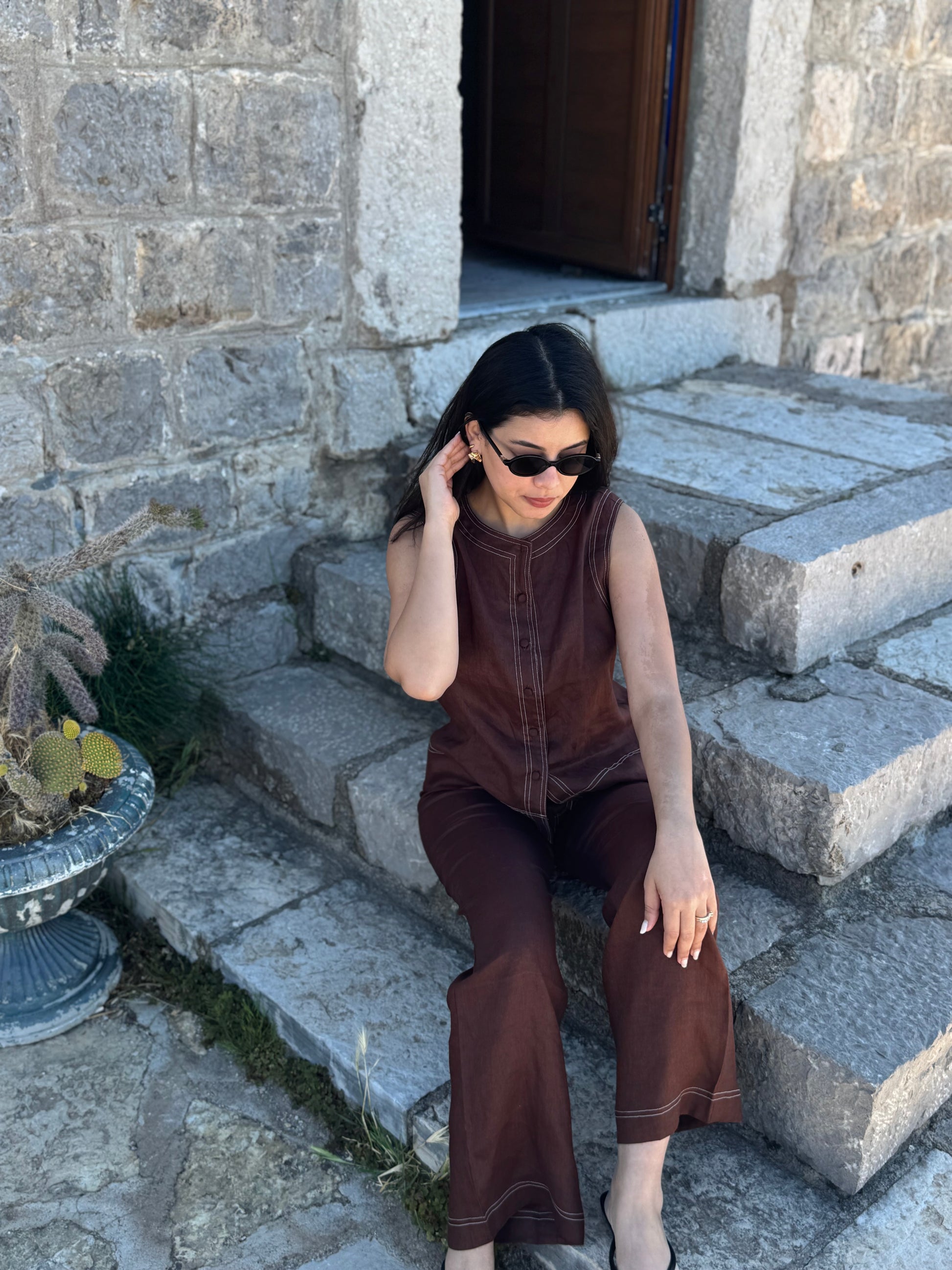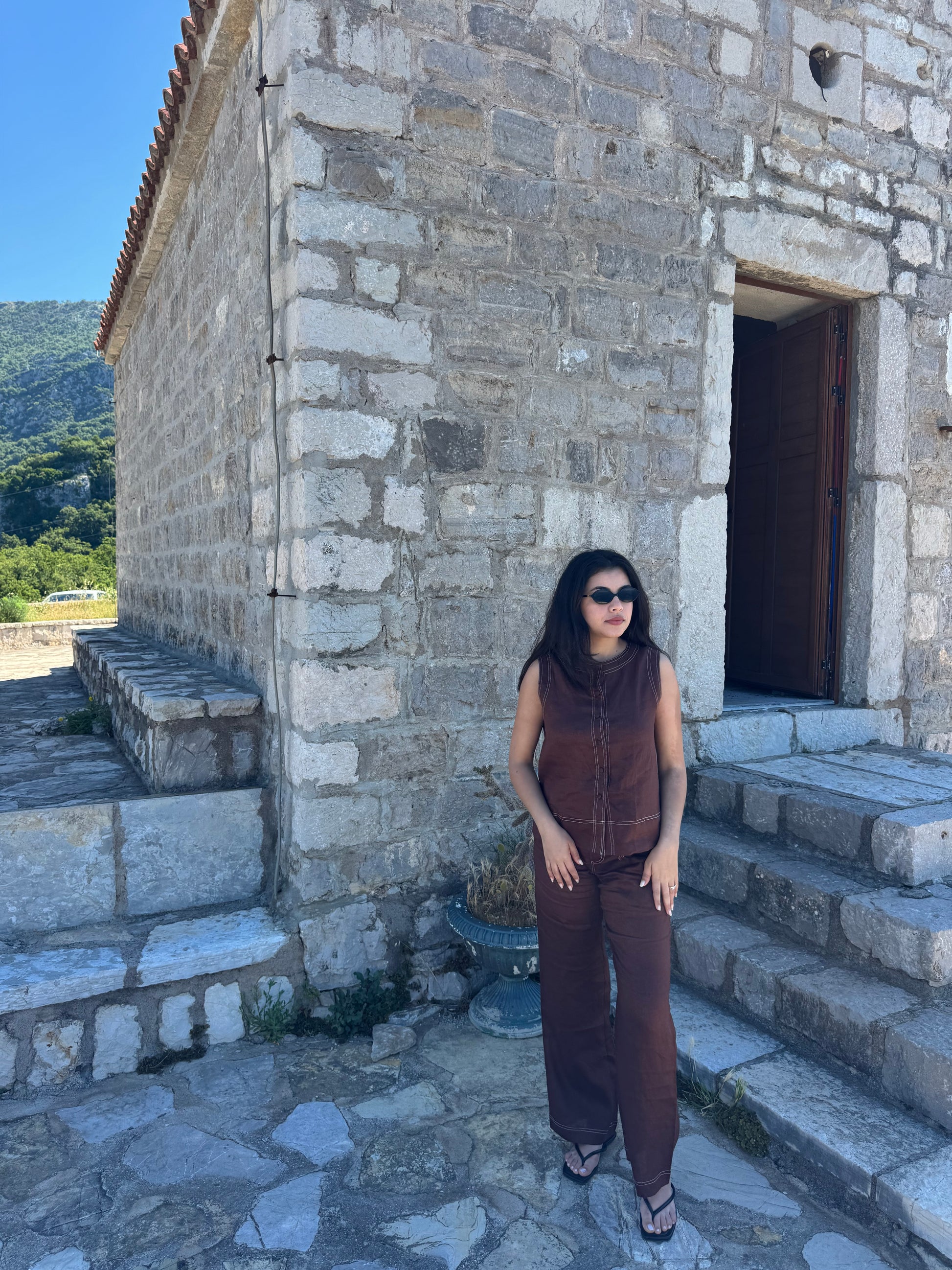 A sleeveless, rust-toned co-ord crafted from breathable linen. The top features a subtle round neckline with exposed front seams and a relaxed, slightly structured fit. Paired with straight-leg trousers detailed with visible stitching, this look brings a grounded elegance and casual strength perfect for sun-drenched getaways or slow city days.